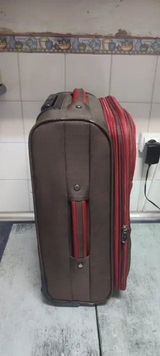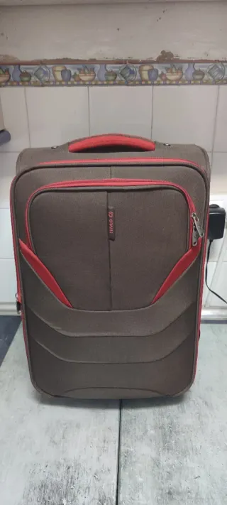 Maleta de cabina de la marca Orali, con un diseño moderno y práctico. - Color principal marrón con detalles en rojo. - Asa superior y cremalleras a contraste. Medidas 52cm de alto 34 cm de ancho y 22cm de fondo