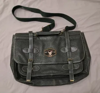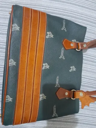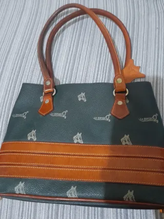Bolso de mano de la marca La Espuela, con un diseño único y detalles artesanales. - Estampado de cabezas de caballo y logo. - Combinación de cuero verde y marrón. - Doble asa de cuero. - Tiras decorativas de cuero en la parte frontal.