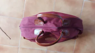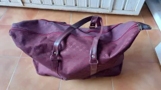 Bolso de viaje de la marca Cristian Lay, con un diseño elegante y práctico. - Color principal burdeos. - Detalles en piel marrón. - Asa de mano. - Logo de la marca en relieve.