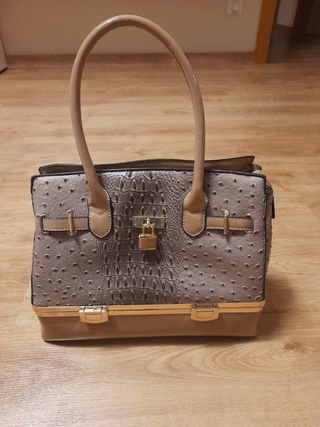 Elegante bolso con un diseño texturizado que combina tonos beige y gris. Presenta un cierre de solapa con detalle de candado y asas superiores. - Material exterior con textura de avestruz y panel central con imitación de cocodrilo. - Detalle de candado dorado en la parte frontal. - Cierres laterales con hebillas. - Base reforzada con detalles metálicos dorados. - Nunca usado, solo conserva algunas marcas de almacenaje, en especial en las asas, tal y como se observa en las fotos.