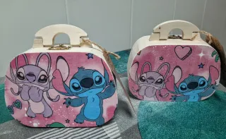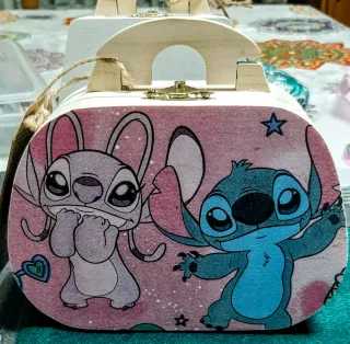 Bolso infantil artesanal hecho de madera, con un diseño encantador de Lilo y Stitch. - Personajes Lilo y Stitch. - Material: Madera. - Estilo: Bolso. - Hecho a mano.