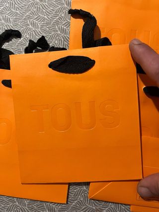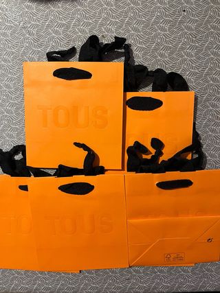 Conjunto de bolsas de regalo de la marca TOUS en llamativo color naranja. Perfectas para presentar tus obsequios con estilo. - Diseño con asas negras. - Logo de la marca en relieve. - hay 6 bolsas y son pequeñas. - Están nuevas sin estrenar. - Se venden todas juntas a 2€ cada una, total 12€.