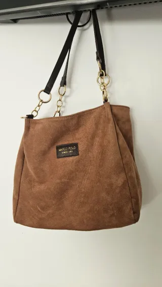 Bolso de mano de la marca Marco Polo. - Material tipo ante. - Cierre de cremallera. - Asas con detalles de cadena dorada.