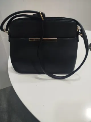 Elegante bolso negro con un discreto detalle metálico dorado en la parte frontal. Su diseño versátil lo hace perfecto para cualquier ocasión. - Cierre de cremallera. - Correa ajustable. - Acabado liso.