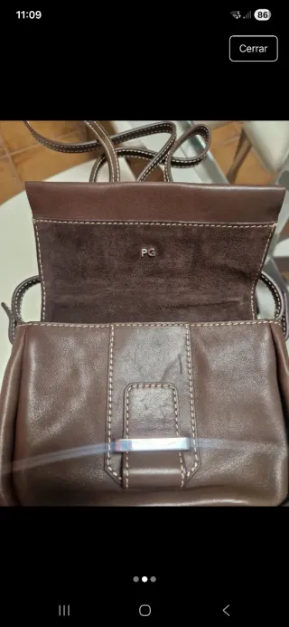 Bolso de piel en color marrón de la marca Purificación García. - Cierre con solapa. - Detalle metálico en la solapa. - Costuras visibles en contraste. Sin etiquetas pero sin usar