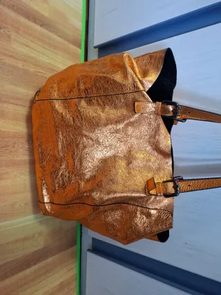 Bolso doble de la marca Carol J. con un llamativo acabado dorado. - Diseño moderno y elegante. - Asa cómoda para llevar al hombro o en la mano. - Cierre con hebilla. - Medida: 45 x 30cm.