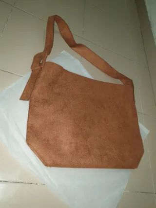Bolso de hombro grande con un acabado suave y agradable al tacto. Estilo ante - Diseño espacioso. - Cierre con un botón,con nudo en la correa.