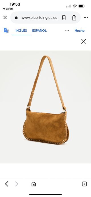 Bolso de ante marrón de la marca Green Coast, con detalle de tachuelas metálicas en todo el contorno. - Cierre de cremallera. - Asa de hombro. - Diseño con tachuelas decorativas.