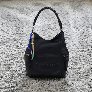 Bolso mochila de la marca Desigual en color negro. Es el modelo perfecto si buscas algo que combine con todo pero que tenga personalidad. Es súper espacioso (casi como una mochila por su capacidad) y muy cómodo de llevar al hombro. Medidas: 14,6 (ancho) x 146 (alto) x 25,6 (largo) mm Diseño: Logo de Desigual grabado en relieve en el frontal. Detalles únicos: Trae colgantes decorativos tipo "trekking" (cuerda y charms en azul y verde) que le dan un toque moderno. Práctico: Tiene dos bolsillos laterales con cremallera para tener las llaves o el móvil siempre a mano. Comodidad: El asa es trenzada y ancha