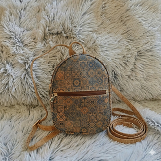 Dale un toque original y eco-friendly a tu look! Vendo esta preciosa mochila de corcho natural con un diseño único de mosaico tipo azulejo hidráulico. Es ligera, resistente y muy organizada. Características principales: Medidas: Alto de 25 cm, ancho de 22 cm y profundidad de 7 cm. Interior: Totalmente forrada para mayor protección de tus pertenencias. Organización: Incluye dos bolsillos internos ideales para el móvil o las llaves. Material: Corcho natural de alta calidad, sostenible y vegano sin manchas ni grietas Diseño: Estampado geométrico de azulejos en tonos tierra y azules. Cremalleras doradas y tirantes ajustables