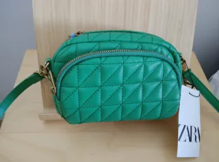 Bolso de mano o bandolera de la marca Zara, con un diseño acolchado y moderno. Aún conserva sus etiquetas originales. - Color verde vibrante. - Acolchado con patrón de rombos. - Cremalleras doradas. - Correa ajustable.