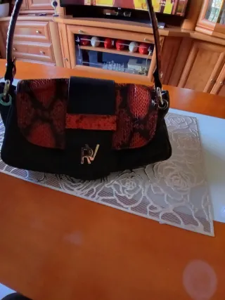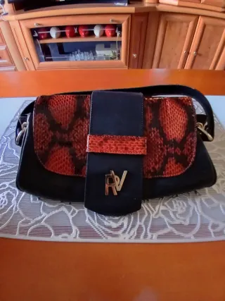 Elegante bolso de mano con diseño de piel de serpiente. - Combinación de piel negra y detalles en naranja. - Logo metálico de la marca RV.