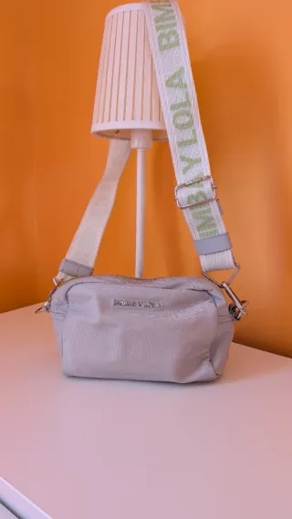 Bolso de la marca Bimba y Lola en color gris. Diseño moderno y versátil. Medidas: 19cm x 14cm x 7cm - Correa ajustable con detalle del nombre de la Firma en verde y blanco. - Cierre de cremallera. - Logo metálico de la marca en la parte frontal. Es de segunda mano, pero está en perfecto estado. No envío