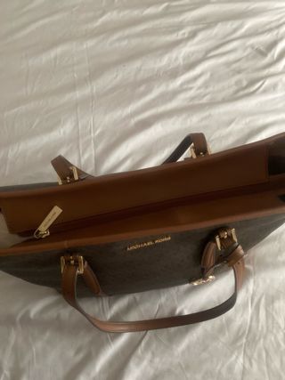 Bolso de mano Michael Kors con un diseño elegante. - Logo de la marca en dorado. - Ribetes y asas en piel marrón. - Compartimento principal espacioso.