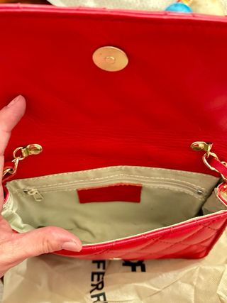 Elegante bolso bandolera de la marca Carla Ferreri. - Diseño acolchado. - Cadena dorada y roja. - Incluye etiqueta.