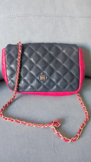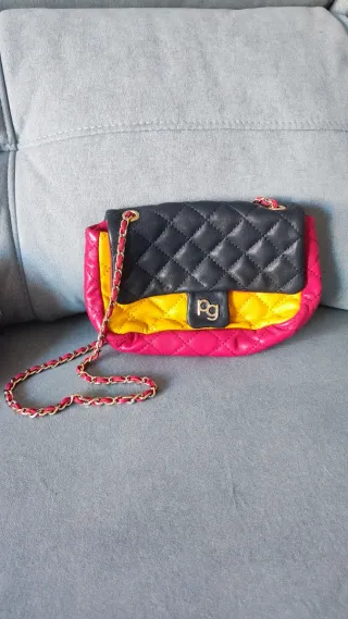 Bolso de mano de la marca Purificación García. - Diseño acolchado. - Combinación de colores azul marino, amarillo y fucsia. - Cadena dorada y fucsia para llevar al hombro. - Logo metálico de la marca en la solapa en tono dorado. - No tiene cremallera, el cierre es con botón. - incluye funda original.