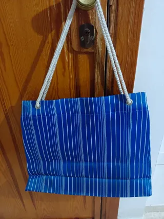 Bolso de tela grande, perfecto para llevar a la playa o de compras. Tiene un diseño bicolor. - Material de tela resistente. - Asas de cuerda blancas.