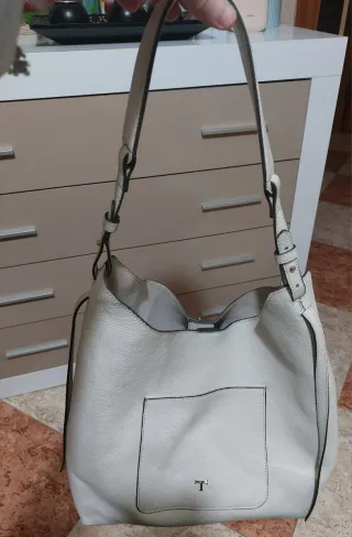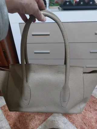 Bolso de piel vuelta en tono beige. - Diseño moderno y versátil. - Cierre seguro. - Asa cómoda para llevar al hombro.