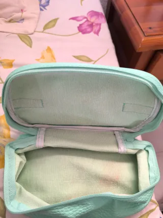 Neceser con un diseño texturizado y un asa para facilitar su transporte. - Cierre de cremallera. - Ribete en contraste.