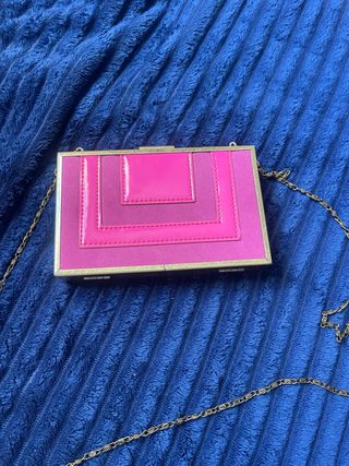 Elegante bolso de mano con cadena. - Diseño geométrico en tonos de rosa. - Acabado metálico dorado en el marco. El tono dorado está un poco desgastado.