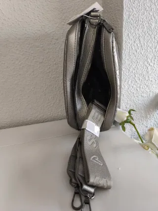Bolso bandolera de la marca Sweet Years con un diseño grabado. Es muy moderno y actuar y muy cómodo no pesa nada tiene un plateado precioso y está nuevo sin estrenar valía 25 euros y se vende en 18 - Color plateado. - Cierre de cremallera. - Correa ajustable.