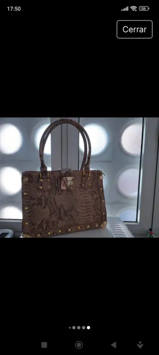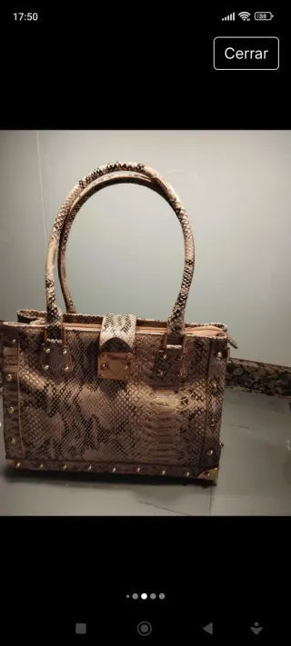 Elegante bolso con diseño de piel de serpiente. - Acabado en tonos beige y marrón. - Detalle de cierre metálico dorado. - Tachuelas decorativas en los bordes. - Asas de mano con el mismo estampado.
