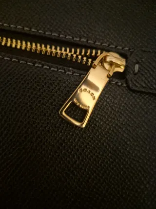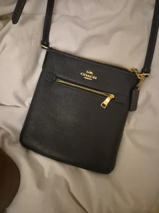 Bolso cruzado de piel en color negro con detalles dorados. - Cierre principal con cremallera. - Bolsillo exterior con cremallera. - Correa ajustable para llevar cruzado. - Logo de la marca en la parte frontal.