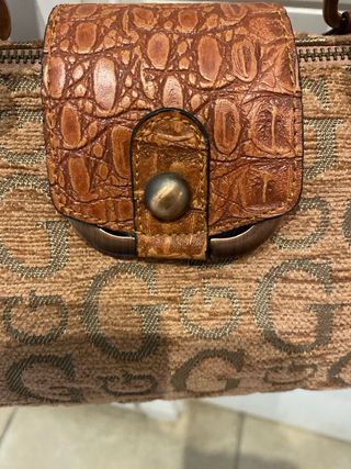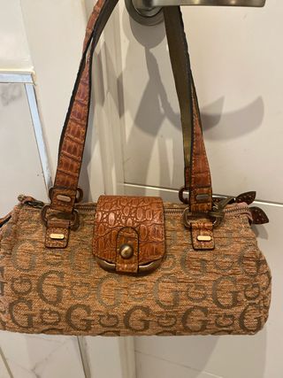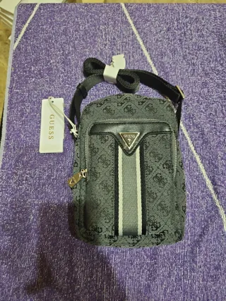 Bolso de mano con un diseño moderno y elegante. Bolso Guess original 100 por cien Tiene dos maneras para llevar con la mano o cruzado En perfecto estado - Estampado monograma Guess. - Detalles en rayas verticales. - Asas cómodas para llevar en la mano. - Incluye etiqueta de la marca.