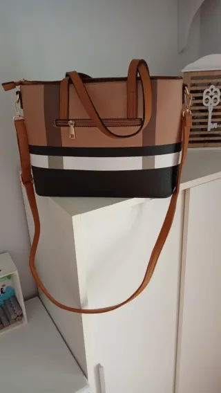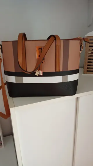 Bolso espacioso con un diseño de rayas verticales y horizontales. Completamente nuevo, usado una única vez! - Asa corta para llevar en mano. - Correa larga ajustable para hombro. - Detalle metálico dorado en la parte frontal. - Base con textura de puntos.