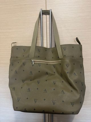 Bolso de mano , hombro original, con un diseño elegante y moderno. Ancho 30. Alto 15 fondo 12 - Estampado con el logo de la marca. - Detalle de textura imitación piel de cocodrilo en la solapa y asas. Lo eta con letras impresas. De mano y hombro pequeño - Cierre de botón a presión. Detalles cobre. Forro verde, un poquito manchado junto bolsillo( se aprecia poco). NO ENVIO. RECOGIDA ALICANTE