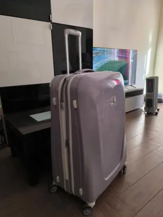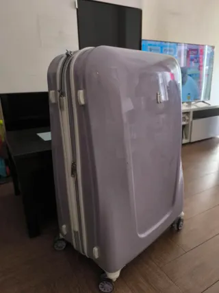 Maleta grande de la marca IT Luggage. Su diseño combina tonos grises y morados, ofreciendo un aspecto moderno y distintivo. - Material resistente y ligero. - Ruedas multidireccionales para facilitar el transporte. - Asa extensible para mayor comodidad. Por fuera está perfecto estado, solo el forro interior que está roto. Cuando te revisan maletas aeropuerto les da igual romperlas. De todo lo demás está bien. Medidas 79cm alto incluyendo las ruedas, fondo 31cm x 50cm ancho. Para maleta facturada. O viajes tren.