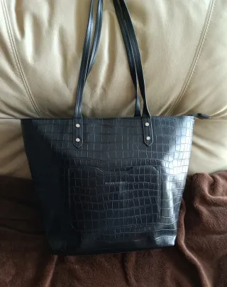 Bolso shopper Paco Martínez negro, nuevo sin uso. Diseño efecto cocodrilo con sello de la marca en el frontal y piezas interiores estampadas. Cierre superior con cremallera, bolsillo trasero con cremallera y varios compartimentos interiores para buena organización. Medidas aprox.: base 26x12 cm, cuerpo 39x32 cm. Asas resistentes para llevar al hombro. Estilo elegante y funcional, ideal para trabajo, universidad o uso diario. Gran capacidad y acabado clásico que combina con todo.