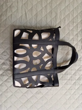 Bolso de mano con un diseño moderno y elegante, perfecto para complementar tu estilo. - Diseño exterior con cortes calados. - Interior en color beige. - Asas cómodas para llevar en la mano.