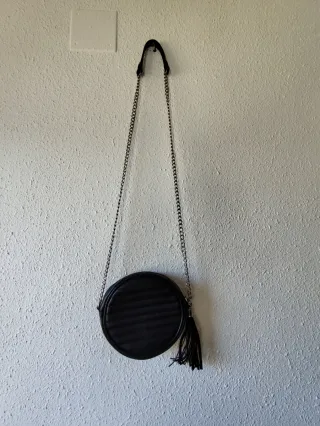 Bolso redondo negro con un detalle de flecos. - Cierre de cremallera. - Cadena metálica para llevar al hombro.