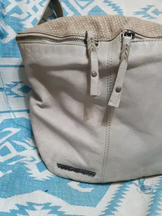 Bolso de piel suave en un bonito tono arena. Su diseño es moderno y versátil. De la famosa marca austríaca Taschendieb. - Material: Piel genuina. - Cierre principal con cremallera. - Correa ajustable para llevar al hombro.