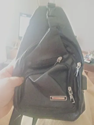 Bolso de pecho tipo bandolera. - Diseño moderno y funcional. - Compartimento principal con cremallera. - Bolsillo frontal adicional. - 2 bolsillos más. - Correa ajustable para mayor comodidad. - Detalle metálico frontal. - USB integrado para powerbank y orificio para auriculares.30cm alto 18cm ancho.
