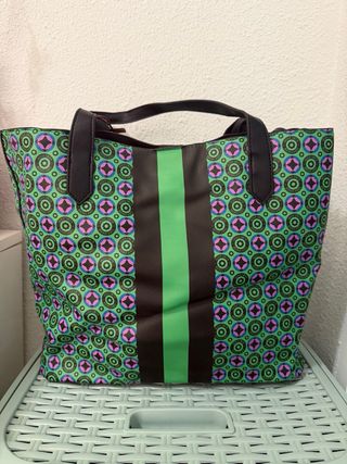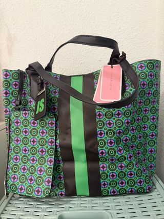Bolso tote de la marca Jackie Smith con un diseño vibrante y llamativo. - Estampado geométrico circular en tonos verdes, morados y negros. - Rayas verticales verdes y negras en el centro. - Incluye un pequeño neceser a juego con cremallera. - Dos asas negras para llevar al hombro o en la mano. -Nunca usado, con au etiqueta. Solo la marca que se ve en la foto de estar guardado. -Medidas: 40 x 32 cm