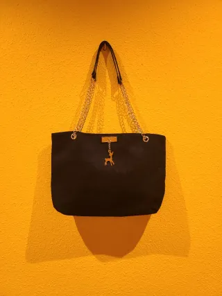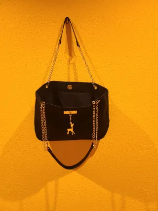 Elegante bolso negro con detalles dorados. - Asa de cadena dorada. - Charm de ciervo dorado. - Cierre de clip,forrado en su interior. Precio - 3.90 €
