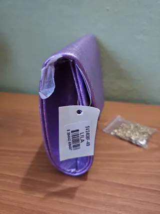 Elegante bolso de fiesta en tono lila, perfecto para complementar tu atuendo. - Acabado brillante con textura. - Detalle metálico dorado en la solapa. - Incluye cadena dorada para llevar al hombro.