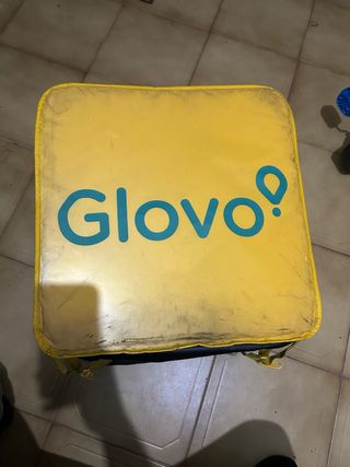 Bolsa de reparto de la marca Glovo. - Color amarillo. - Logo de Glovo en color azul.