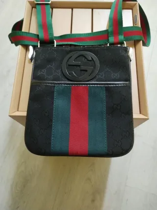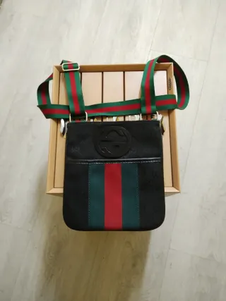 Bolso bandolera de la marca Gucci. - Diseño con el monograma GG. - Tira de tela con las rayas verde y roja. - Detalle frontal con el logo GG en negro.