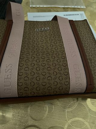 Bolso de la marca Guess con un diseño moderno y elegante. - Color principal marrón con detalles en rosa. - Estampado de logo característico de la marca.