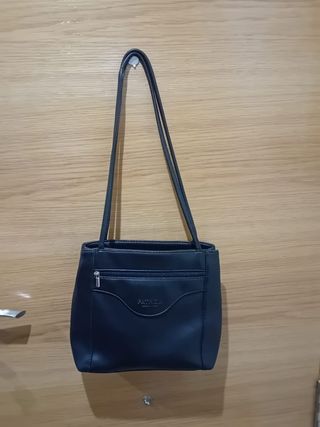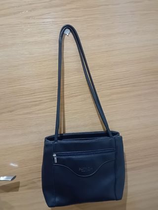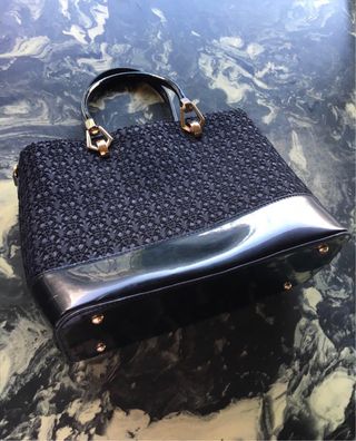 Bolso en color negro, forrado la mitad en tela con reflejos en brillo plateado y charol, acompañado de remaches en color dorado. Es de asa corta y se le puede añadir el asa larga en los laterales para llevarlo colgado, tambien lleva en el interior en uno de los laterales dos bolsillos con cremallera y en el lateral contrario dos bolsillos mas pequeños para meter movil o llaves; en una de las caras exteriores tambien lleva como se puede observar en la foto, otro bolsillo con cremallera. En la parte baja(terminacion-lateral del bolso)se puede observar que lleva unas pequeñas rozaduras. Por lo demas esta perfecto. Mas articulos en mi perfil