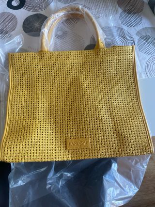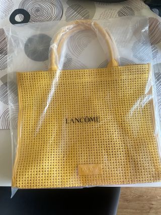 Bolso de playa de la marca Lancôme en color amarillo. A ESTRENAR - Diseño tejido. - Asas cómodas..