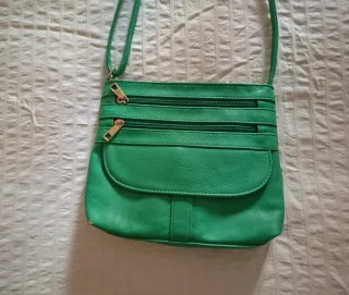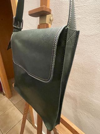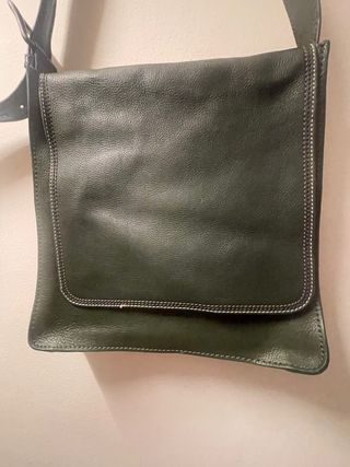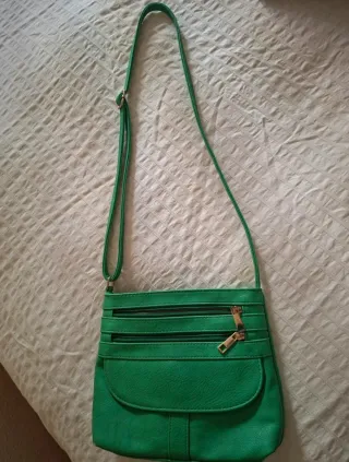 Bolso de mano en color verde, con un diseño moderno y práctico. - Tres compartimentos con cremallera. - Solapa frontal con cierre. - Correa ajustable. - Está en muy buen estado, pero una de las hebillas tiene el esmalte de metal un poco rasgado. Última foto.
