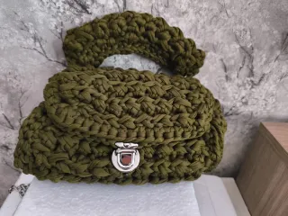 Bolso tejido a mano de la marca Libélula Trapillo. - Color verde oliva. - Diseño único y moderno. -Borla decorativa -Cadena metálica plateada