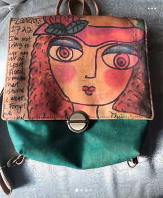 Bolso de arte con diseño único. Rostro de mujer y letras. Cierre de metal Correas ajustables. La puedes llevar en tres posiciones Pintada a mano y trabajada en corcho por artista Portuguesa.
