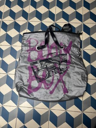Bolso grande de la marca Miss Sixty en color plateado. Presenta un diseño llamativo con un estampado de boombox y detalles en morado. - Cierre de cremallera. - Asas de charol negro. - Cordón ajustable en la parte superior.