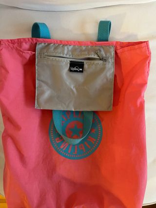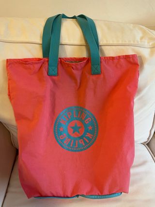 Bolso plegable de la marca Kipling, con un diseño práctico y moderno. - Color principal rosa vibrante. - Asas y detalles en color turquesa. - Logo circular de Kipling en la parte frontal.