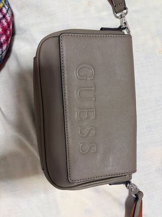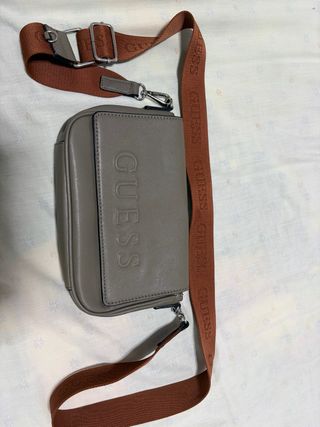Bolso de la marca Guess con correa ajustable. - Diseño moderno en color caqui . - Correa de tela en tono marrón con logo. - Cierre de boton.